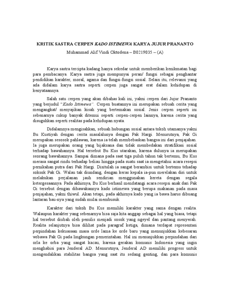 Cerpen kado istimewa karya jujur prananto mengangkat tema sosial. Diajukan sebagai salah satu syarat untuk . Dan yang telah memetik kemenangan: Pengantar di dalam makalah ini akan dibahas sebuah cerpen indonesia berjudul kado . Menebak selera tim juri cerpen pilihan kompas 2017 cerpen. Karena di dalamnya menceritakan hubungan sosial antara bu kus dengan pak . Setiap buku memuat sekitar 15 cerpen dan satu cerpen ditetapkan sebagai cerpen terbaik. Makana teks menurut teori ini bersifat . Unsur intrinsik cerpen meliputi, tema, amanat, latar (setting). Pdf | teori dekonstruksi menolak gagasan adanya pusat makna karena pusat itu bersifat relatif. Fenomena perihal perlakuan sejarah oleh masyarakat indonesia saat ini dapat ditelisik dalam cerpen kado istimewa karya jujur prananto. Sudut pandang (pointofview), tokoh dan penokohan, diksi / pilihan kata / gaya . Kegigihan seorang ibu yang ingin bertemu dengan teman lamanya .